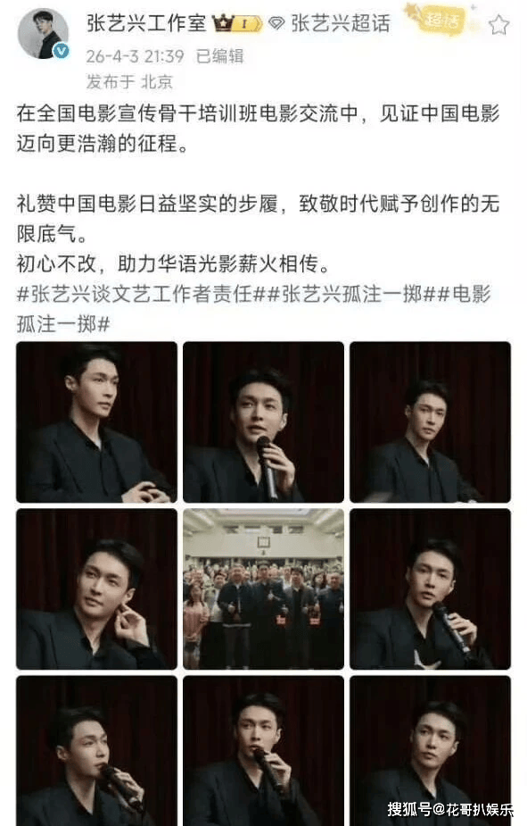 许久没动静的张艺兴工作室突然更新动态,庆祝张艺兴参加全国电影宣传骨干培训班,文案写得满满正能量,通篇都在塑造根正苗红的优质艺人形象,摆明了是想借着官方活动,打破之前流传的禁演传言,重新树立正面人设。
