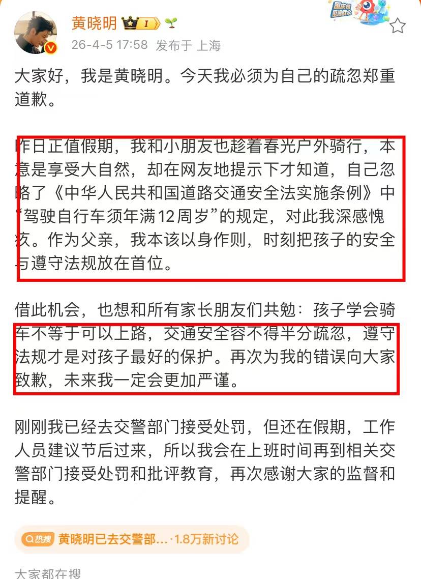 黄晓明也是万万没想到,因为陪同9岁儿子小海绵骑行引发网友热议,很多人表示交规不允许12岁以下的孩子在共用车道骑行,黄晓明本来是秀父爱情深,想不到翻车了,在网友的提醒下他主动去当地交警部门去接受罚款。