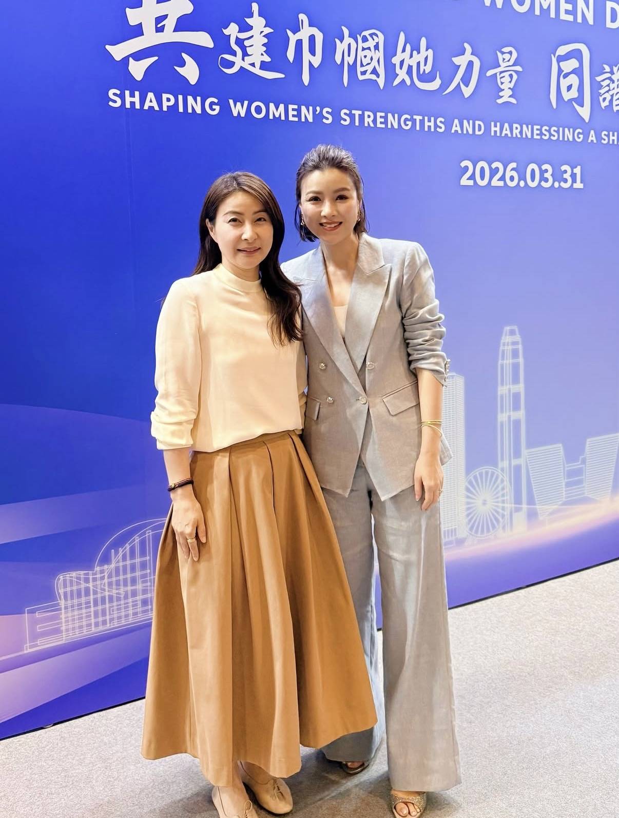 在2026家庭妇女暨妇女发展高峰会上,TVB小生陈豪与妻子陈茵媺成为了受邀出席的嘉宾之一,夫妻俩还上台演讲。陈茵媺在社交平台上晒出了出席高峰会的照片,当天她身穿了加大码的西装套装现身,显得又飒又干练,陈豪倒是穿着休闲,显得平易近人。两人在台上默契十足,分享家庭生活,陈茵媺还不时开怀大笑,展现出真性情。