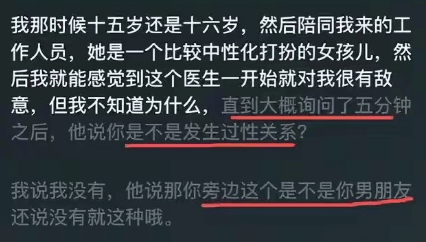 从头到尾,没有一个人征求过她的同意,没有一个人告诉她 “你可以拒绝这些人在场”,更没有人联系她的监护人。一个未成年的女孩,就在这样充满羞辱和冒犯的环境里,完成了这场本该是治病救人的检查。