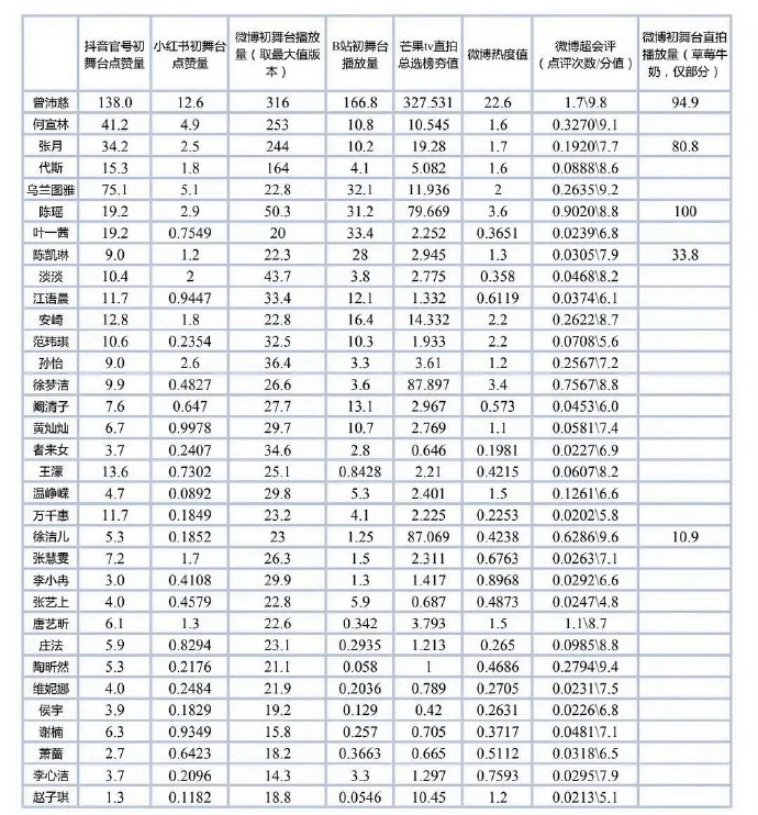 微博初舞台播放量、直拍播放量等核心数据里,曾沛慈同样全面领跑,微博热度值22.6也断层领先,真正实现了全平台无死角的人气碾压。