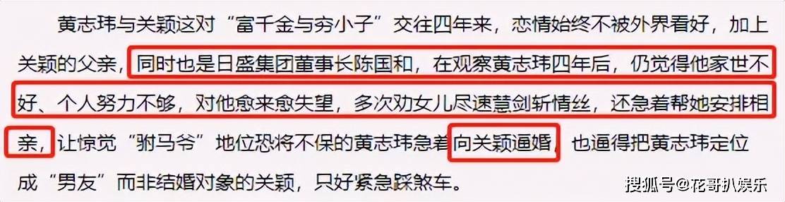 关颖和黄志玮在一起四年,从2003年到2007年,这段感情从一开始就不被看好,毕竟两人家境天差地别,关颖的父亲也一直不同意,觉得黄志玮不够上进,观察多年始终不满意。