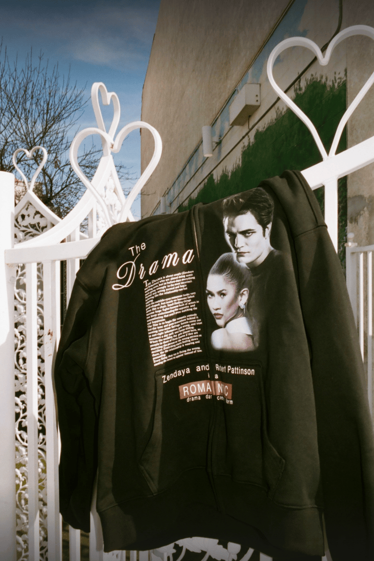 衣服上印着勾勒剧情的乱码文字,以及一幅极具视觉冲击力的夸张图案——帕丁森在《暮光之城》中饰演的爱德华,与走在《挑战者》红毯上的赞达亚被拼贴在了一起。