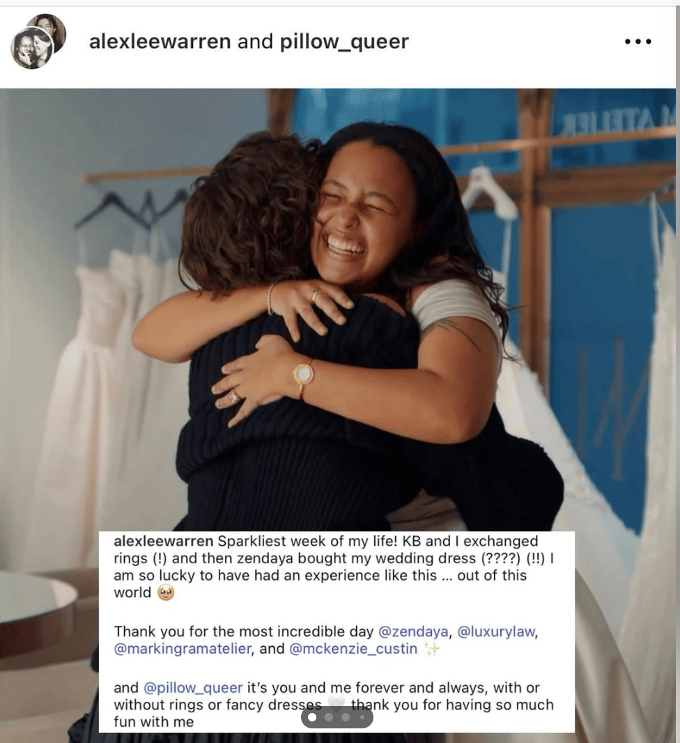 比如,主创团队会特意为粉丝们解决现实生活中的情感难题;赞达亚和造型师罗奇还为一位毫不知情的新娘买下了一件婚纱 ,给了她一个巨大的惊喜。