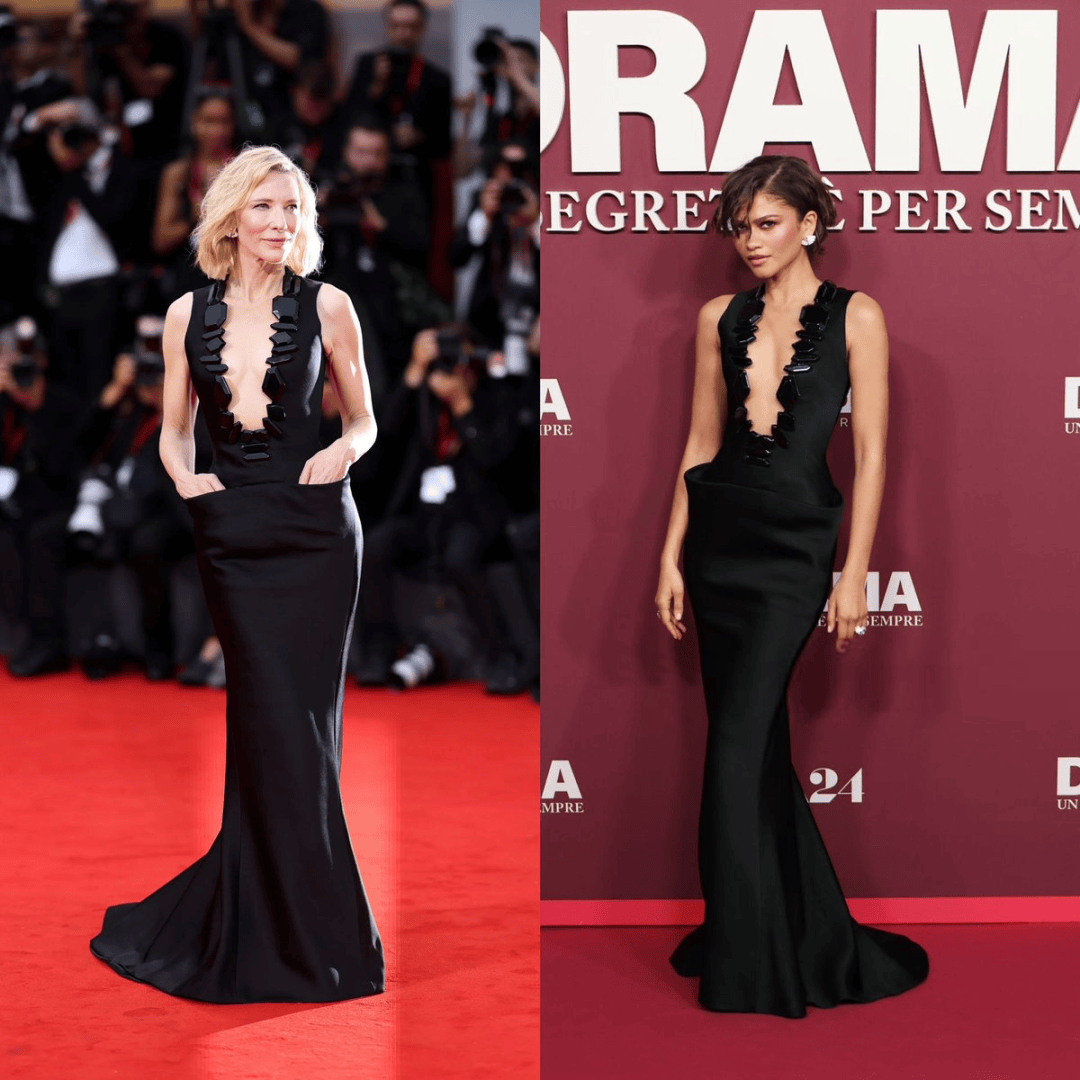 而在罗马的放映活动中,两届奥斯卡得主凯特·布兰切特则慷慨相借,从个人珍藏中借出了一件阿玛尼高定黑色礼服,其深V领口点缀着华丽装饰,这便是那“一点借”。