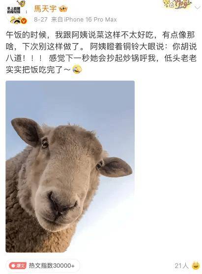 又或者,吃到阿姨做的菜不太合口味,他也不端架子,随手发上网小小吐槽。