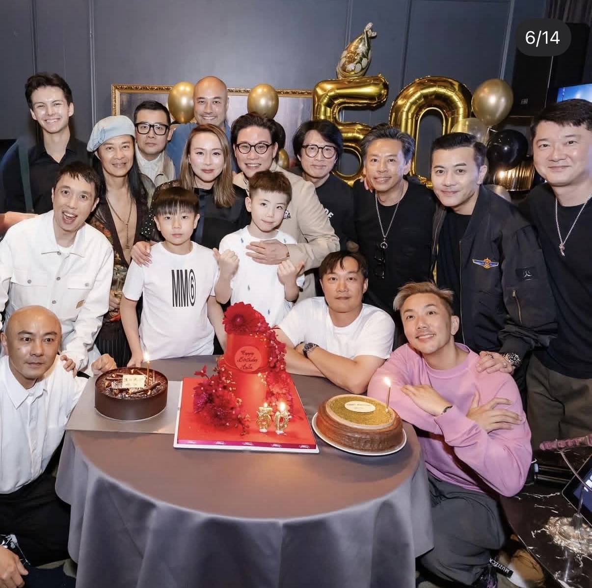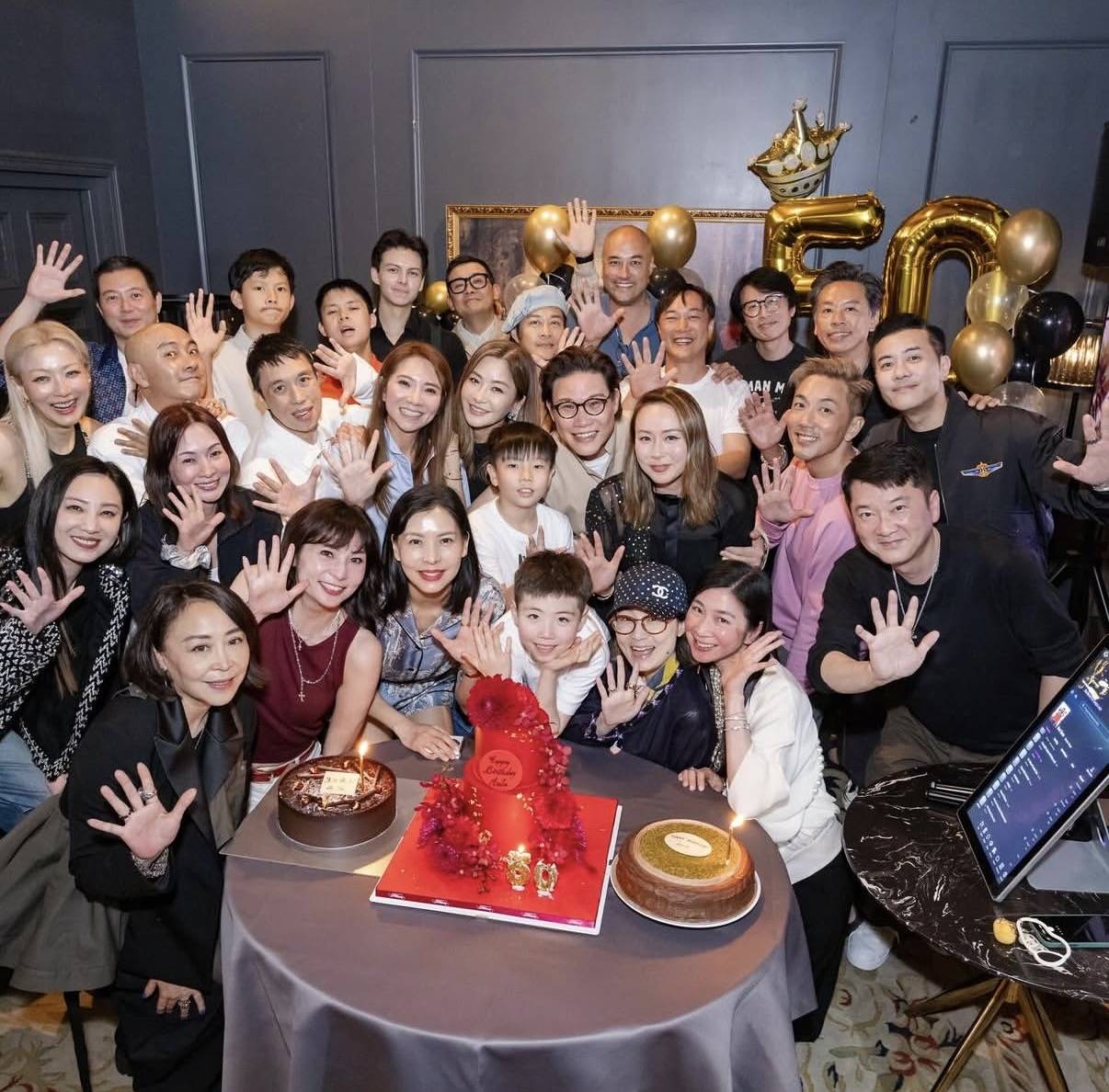 由于到场的各位都是好友、闺蜜,大家关系甚好,不分你我,所以合照的时候也就无所谓谁前谁后,就是图个开心而已。事实上在大合照的时候,站在第一排的还不是苏永康一家人,倒是车婉婉的儿子以及雷颂德妻子梁家玉在前排最中间,不过苏永康一家三口也还算是在中间的位置,而那些天王天后们,比如郑秀文、张卫健、陈奕迅都被挤到边上了。现场准备了三个蛋糕,其中主打的蛋糕最抢镜,红彤彤的,有两层高,另外旁边还有两个常规款蛋糕,总之仪式感十足,相当热闹。