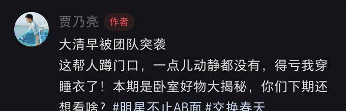 贾乃亮早上刚睡醒,他的团队就悄悄蹲在他卧室门口,突袭查房,门慢慢开了,他穿着条纹睡衣,头发有点乱,脸上一副刚醒的样子,别看穿着睡衣,但依旧帅气。他忍不住吐槽团队,这帮人蹲门口一点动静都没有,还好自己穿了睡衣。