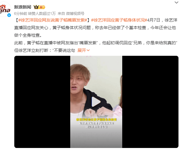 徐艺洋在4月7日直播中严肃回应网友对黄子韬“嘴唇发紫”的健康担忧,当场打断其玩笑表态,明确表示去年已安排基础体检且结果正常,2026年将督促黄子韬完成全身检查。