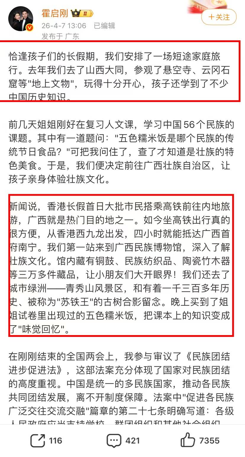 霍启刚郭晶晶一家五口清明假期赴广西开展民族文化研学之旅,因接地气的教育方式和温馨互动引发热议,霍启刚还亲自发文分享了这场“累并快乐着”的亲子体验。