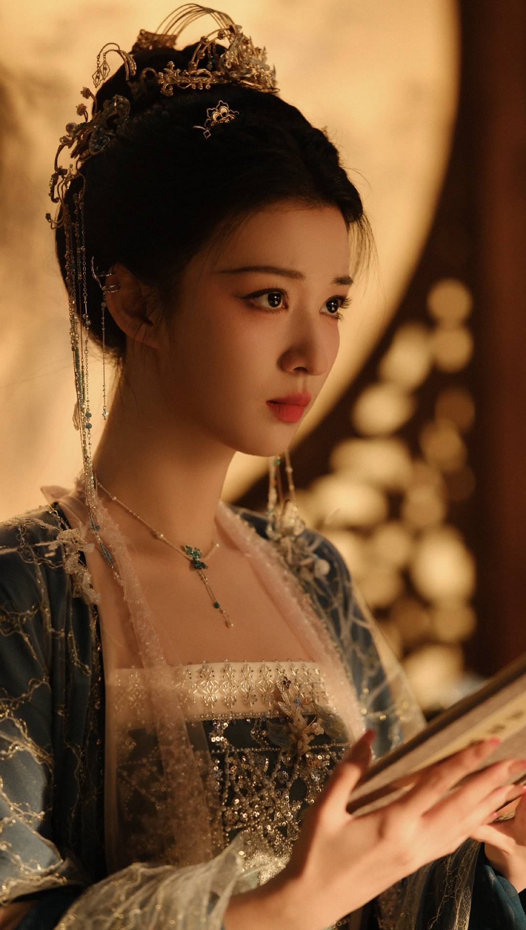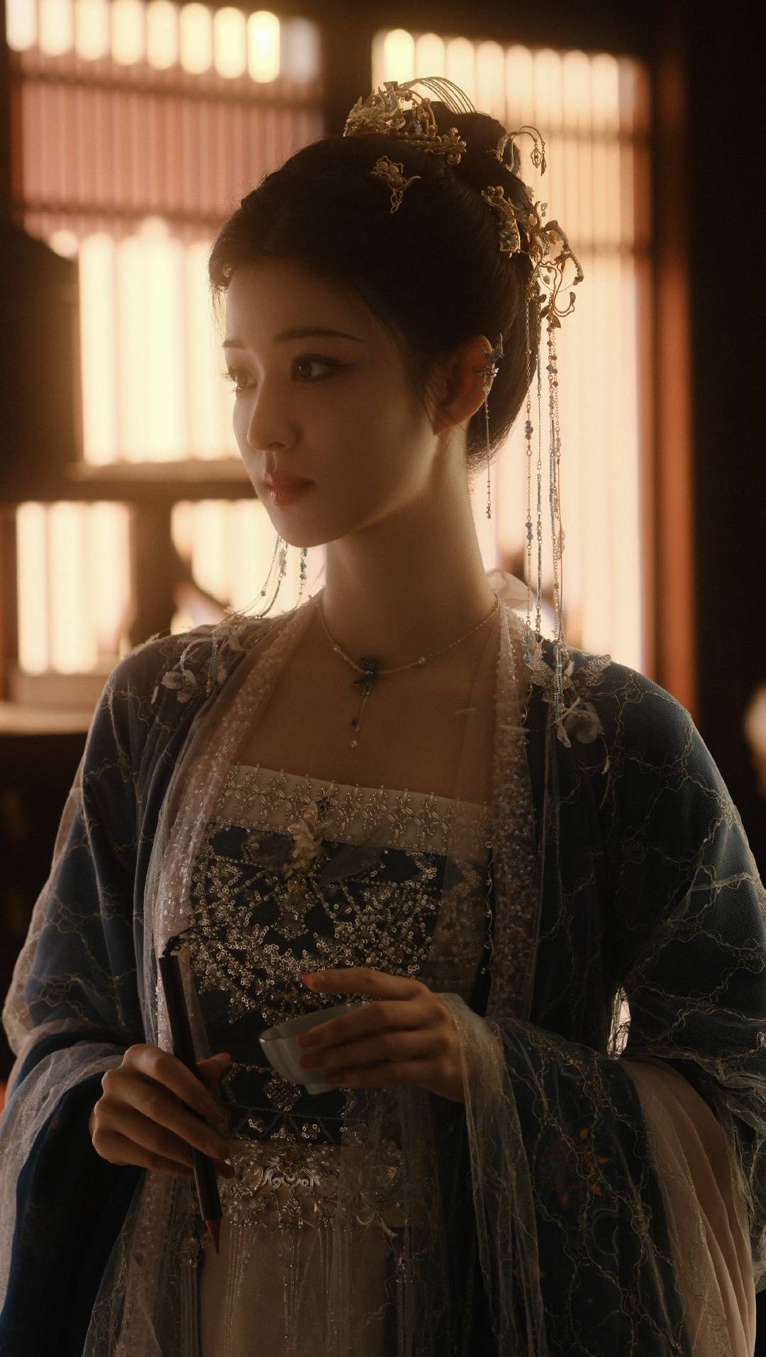 米白长袍绣着淡金暗纹,走动时像月光在流淌,蓝色纱衣轻透如烟,袖口银线如水波荡漾,金色外袍在阳光下泛着柔光,衬得肤色胜雪,连指尖蔻丹都透着讲究。