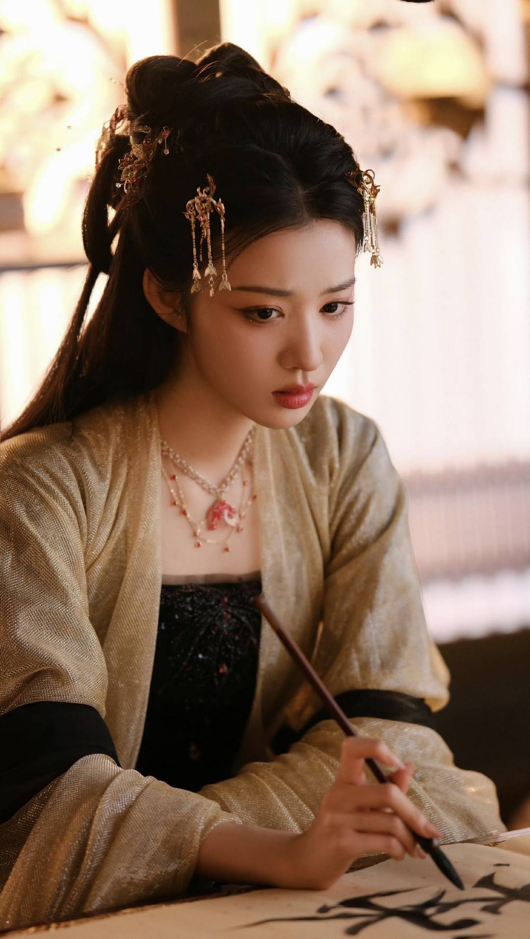她的眼神是最动人的“留白”∶执笔时睫毛低垂,眼尾淡粉眼影像春日桃花。