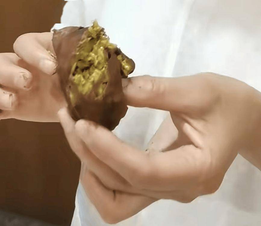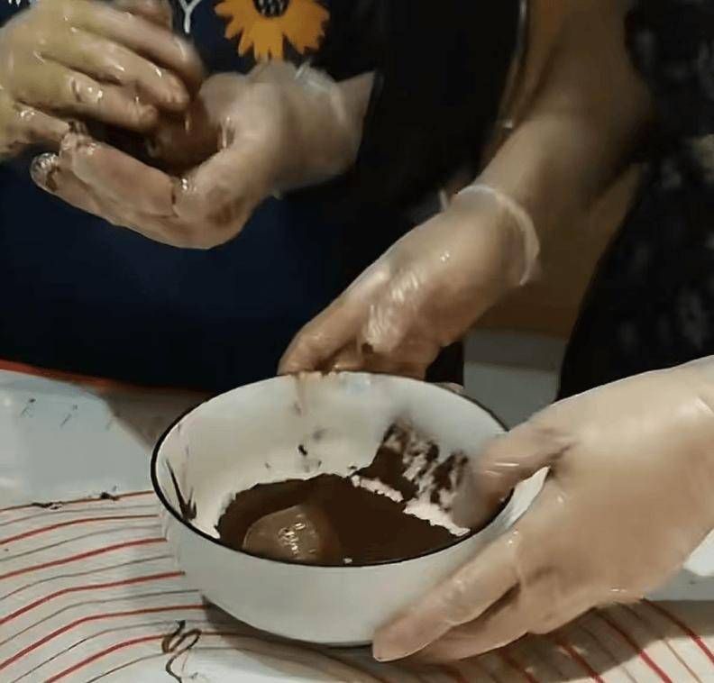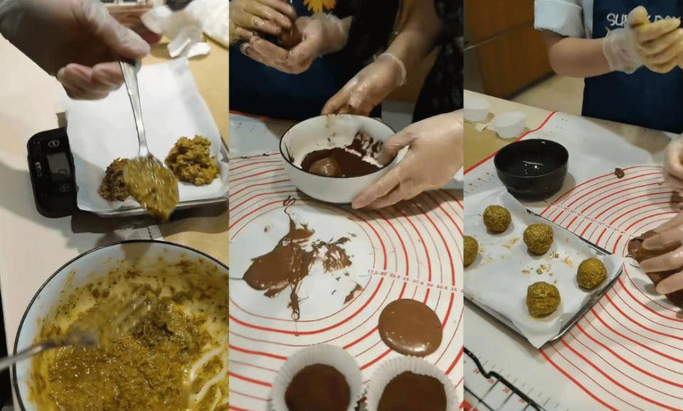 完成干粉搅拌后,她又变身 “称重小能手”,把开心果酱馅料分成均匀的小份,用小手搓成圆滚滚的小球,再小心翼翼地裹上巧克力酱,每一步都做得有模有样,让人忍不住想起她之前做草莓蛋糕时的专业架势。
