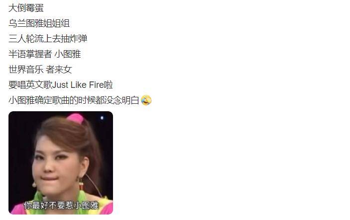 最终,乌兰图雅团只能选择《just like fire》,要知道,网友们让乌兰图雅和者来女组队,是想让她们唱民族歌曲,结果不仅要放弃民族,还要放弃中文,直接挑战英文。