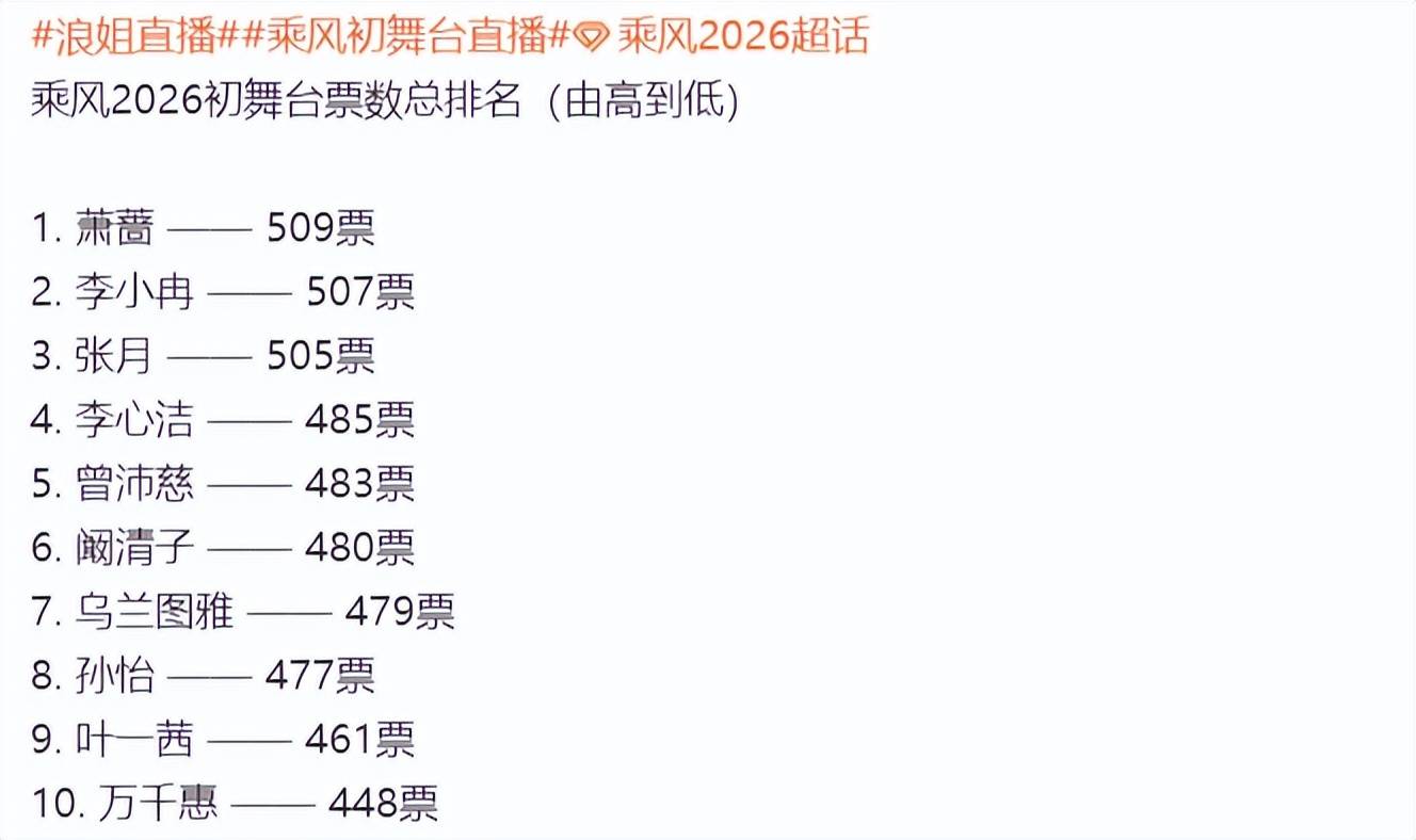 当所有姐姐都表演结束后,初舞台排名进行更新,在初舞台上半场,阚清子获得480票,获得第一名,要比乌兰图雅还高1票,其实出现这样的情况很正常,因为大部分现场观众都是更看感受的,和阚清子感同身受了。