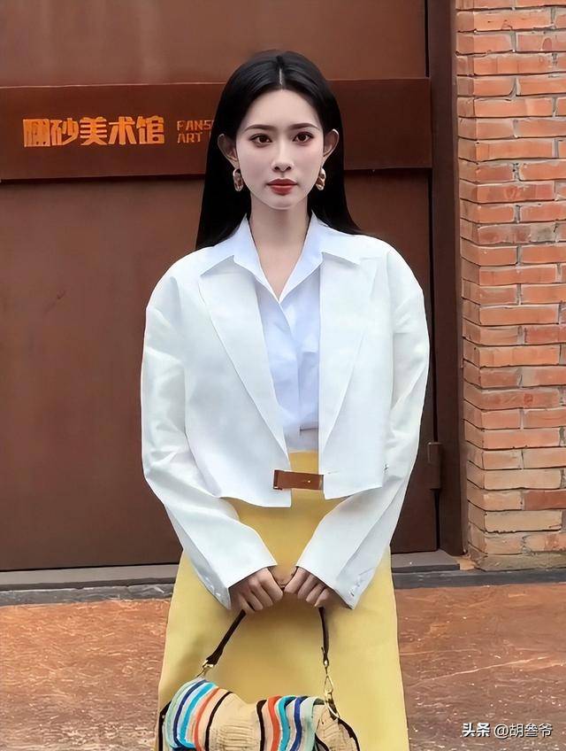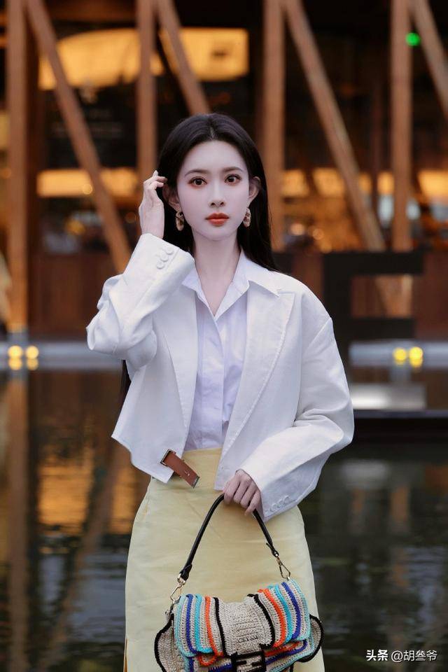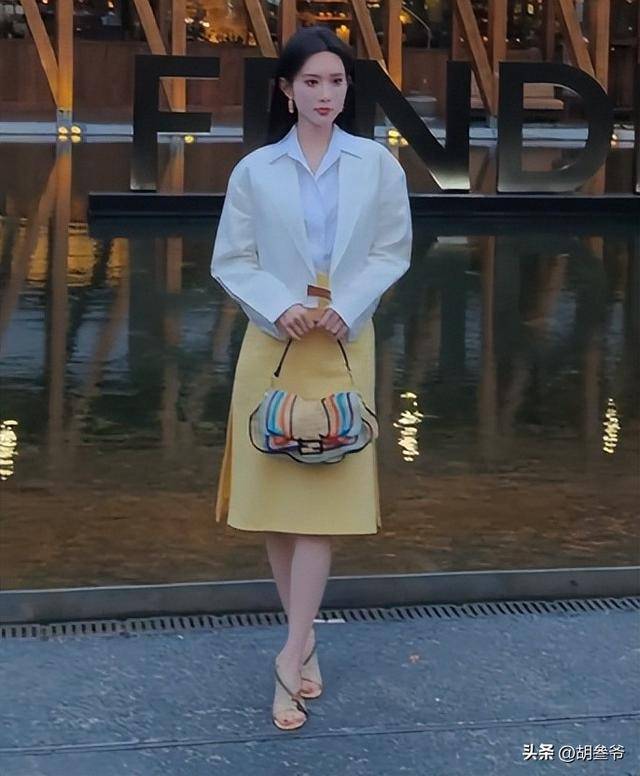 白色短款西装内搭白衬衫,下身配明黄色高开叉半裙,手里拎着FENDI经典Peekaboo包袋,直接把都市精英感拉满。