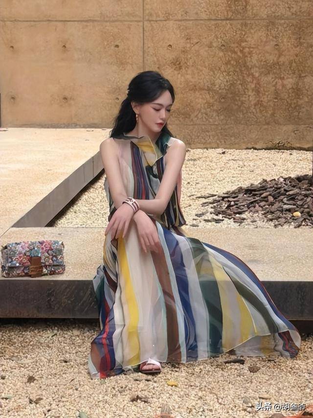 唐嫣穿了一件彩色条纹无袖薄纱长裙,雪纺材质轻盈飘逸,半扎长发搭配精致红唇妆容,仪态舒展又大气,完全是顶级女明星的姿态。