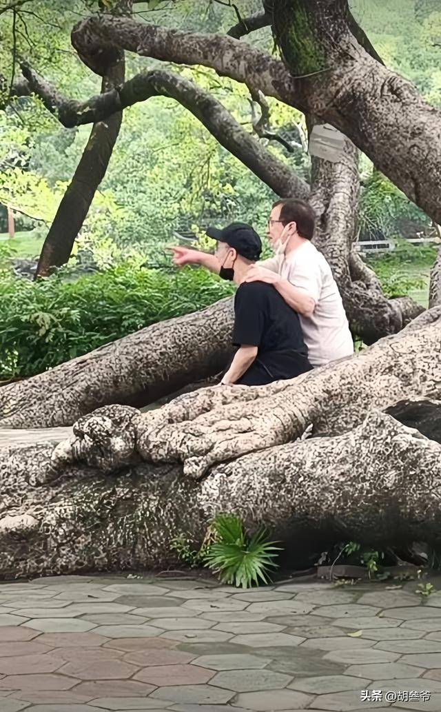 最戳人的一幕,是父子俩并肩坐在古树根部休憩,成龙自然地将手搭在儿子肩头相拥,侧头轻声交谈,感情真是好。