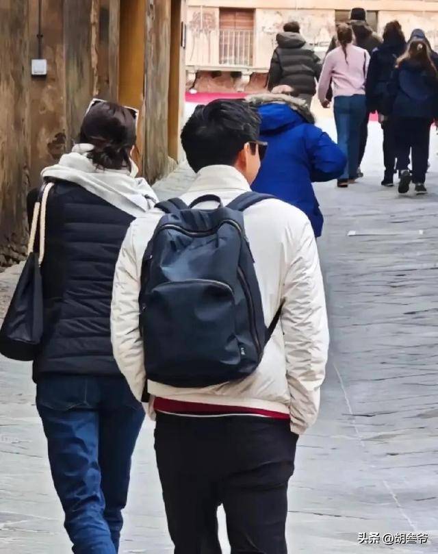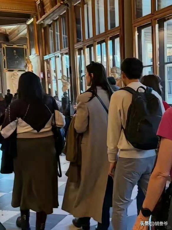 照片里她穿的浅灰色长款大衣,和春节期间网友在佛罗伦萨乌菲兹美术馆偶遇她时的穿搭一模一样。