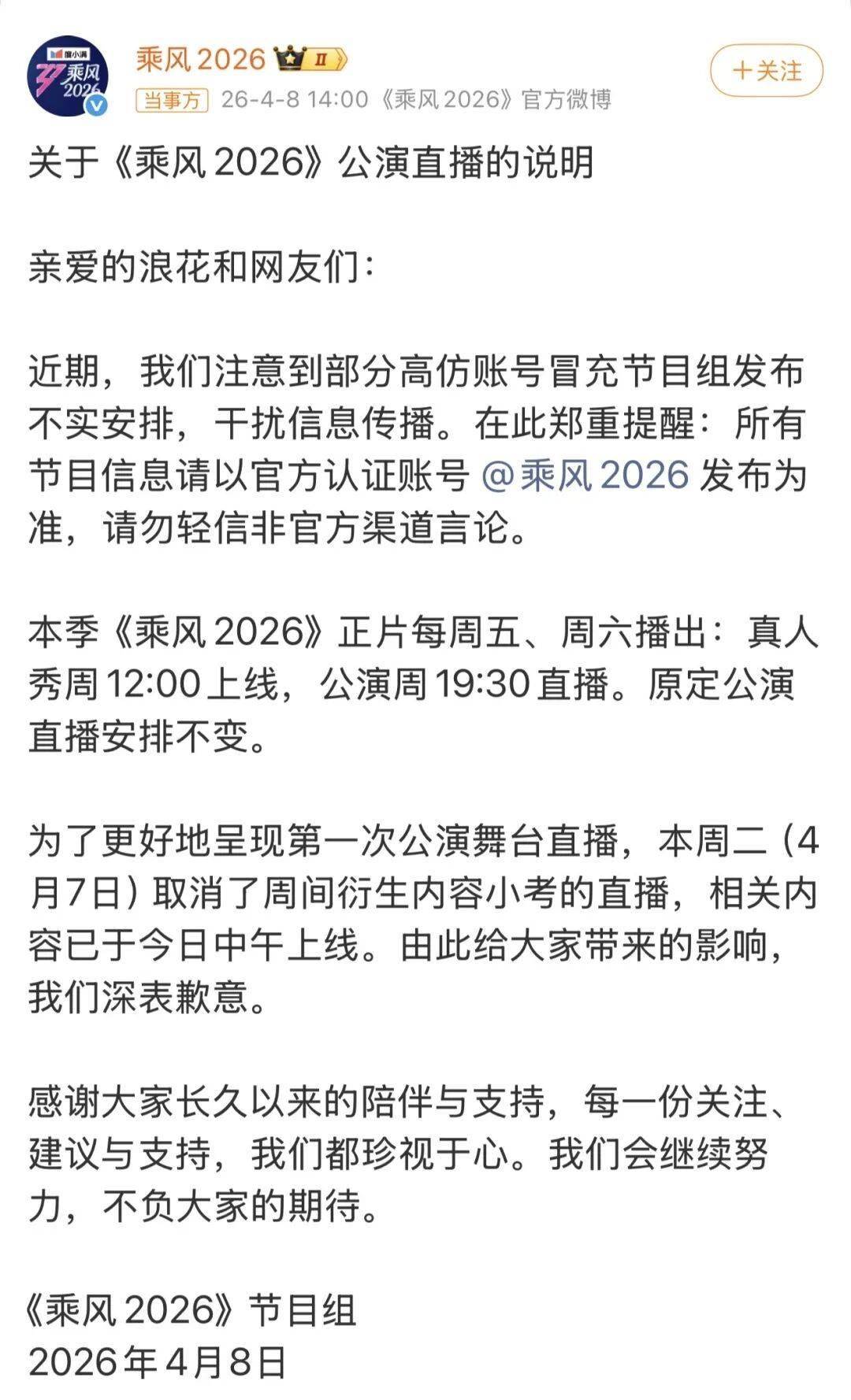 对此,《乘风2026》的官方账号公布声明:节目正片在周五、周六播出,真人秀周在12:00上线,公演周在19:30直播。