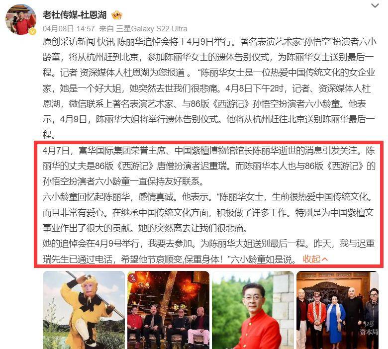 除了亲友和公司员工之外,很多娱乐圈明星也去送别了陈丽华,包括《西游记》剧组的六小龄童夫妇,两人一早就来到了殡仪馆。