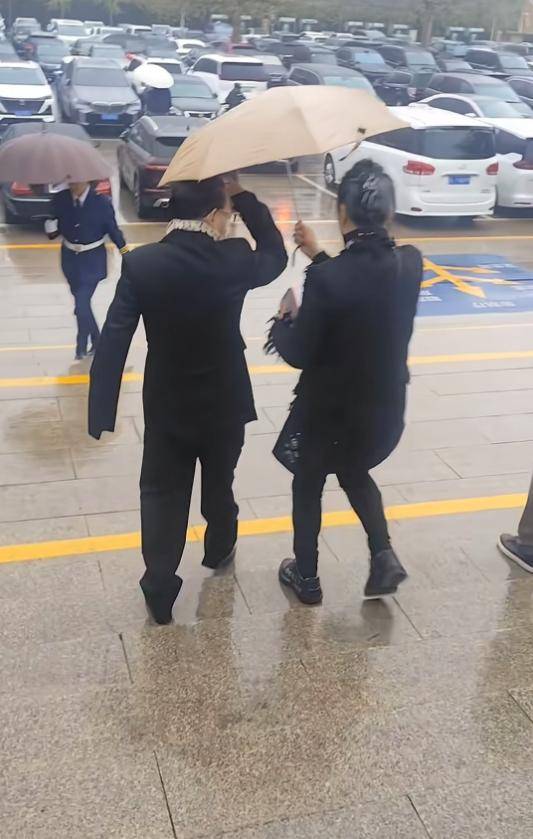 画面中,六小龄童穿了一身黑色衣服,妻子于虹陪伴着,夫妇俩打了一把伞,悼念后两人一同离开了。