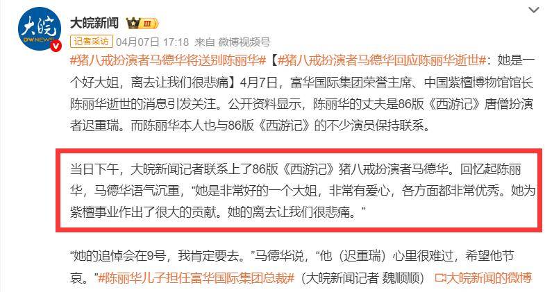在采访中,马德华表示,陈丽华是一位非常好的大姐,非常有爱心,各方面也都非常优秀,她的离去让我们很悲伤,希望迟重瑞节哀。