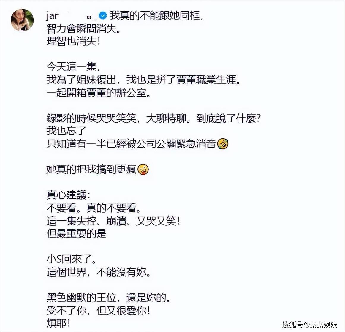 小S在姐妹中间其实也起到了一个很重要的作用,贾永婕早前在和小S录制节目的时候,她们就大聊特聊,贾永婕说她是黑色幽默的王,小S回来了,这个世界不能没有你。