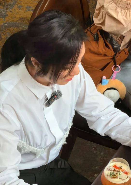 她上身是基础款白衬衫,干净简约,下身搭配灰色阔腿裤,面料柔软宽松,头发扎成低马尾,留着轻柔斜刘海,造型毫无修饰感。