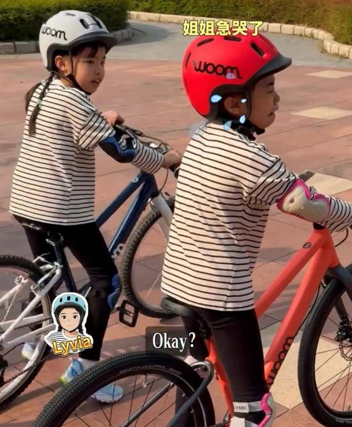 熊黛林为女儿们准备的是没有辅助轮的自行车,而且车架也比较高。 但对于个子高挑的俩女儿来说也能驾驭。