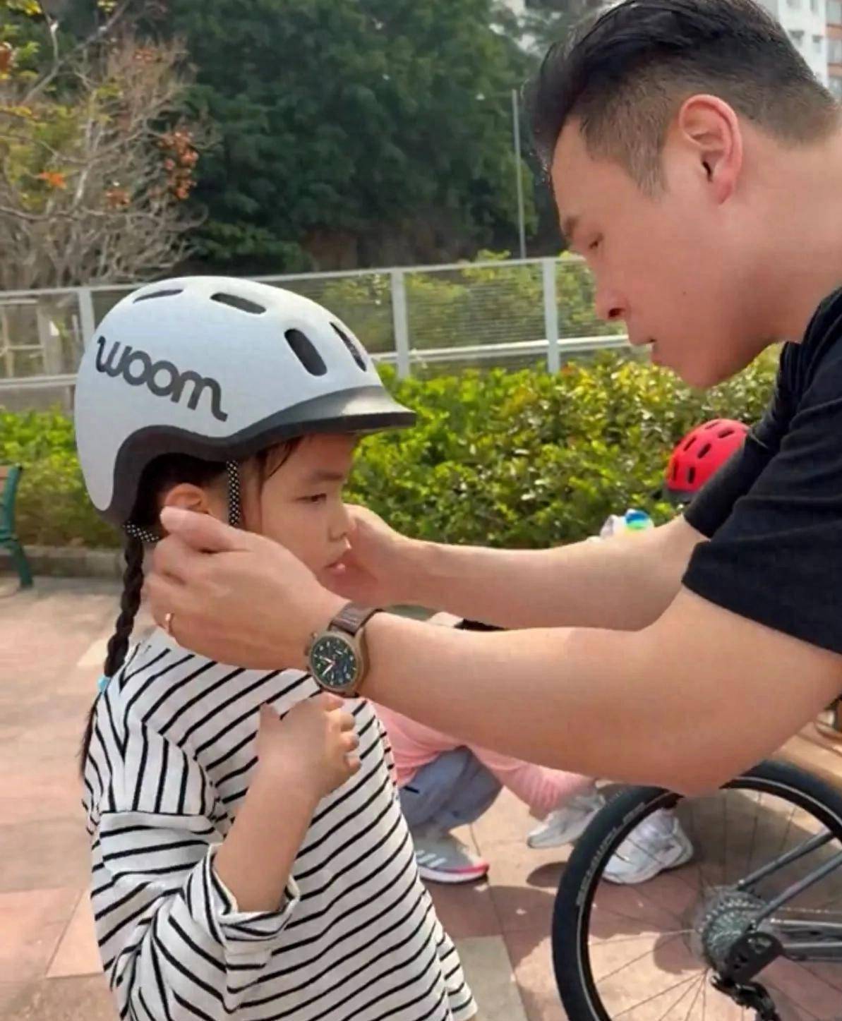 当日,一家四口去到公园找了一个空旷的地方准备开启骑车教学。 郭可颂贴心地为女儿们戴上护具。