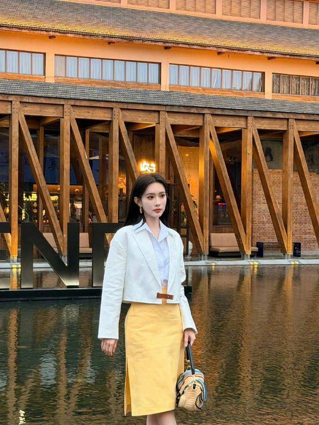 她穿了一身白色西装,内搭白衬衫,下身搭配一条鹅黄色高开叉半裙,冷白肤色在灯光下像釉色一样透亮。