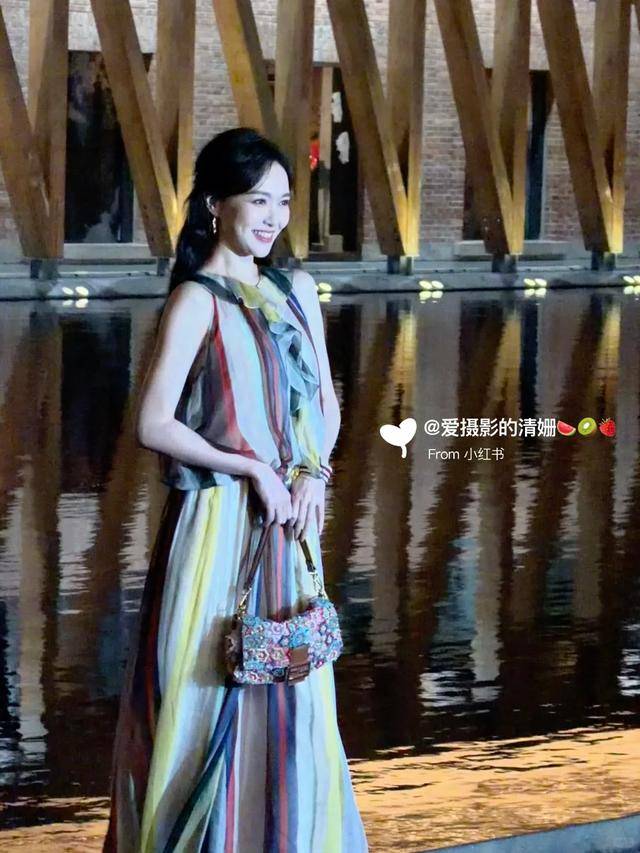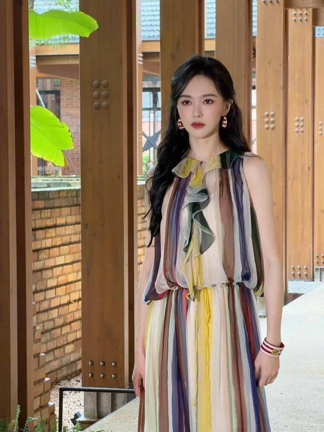 她穿了一袭彩色条纹薄纱无袖长裙,雪纺面料轻盈飘逸,风一吹裙摆轻轻荡漾,仙气又灵动。