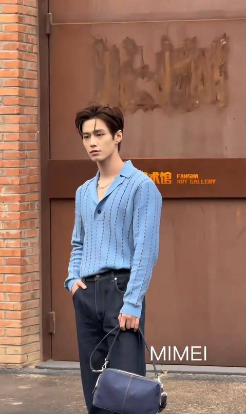 他穿了一件冰蓝色竖条纹针织开衫,版型宽松舒适,露出精致的锁骨,少年感十足。