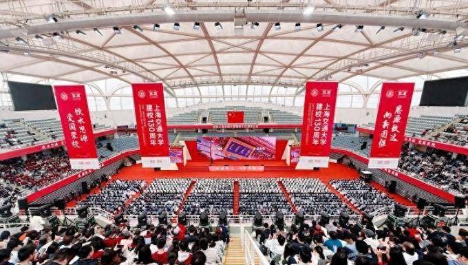 闵行校区霍英东体育中心内,数千名海内外校友、院士专家、各界嘉宾与全校师生齐聚一堂,“饮水思源,爱国荣校”的校训高悬在会场上方,气氛庄重而热烈。