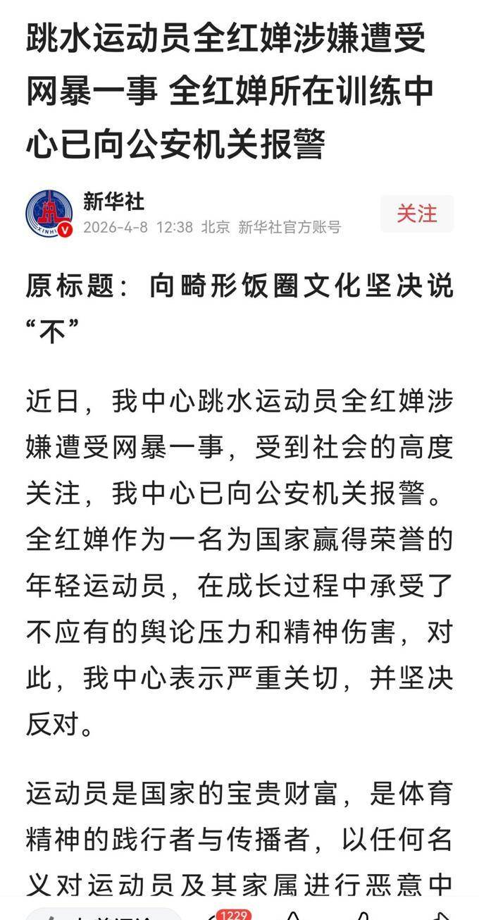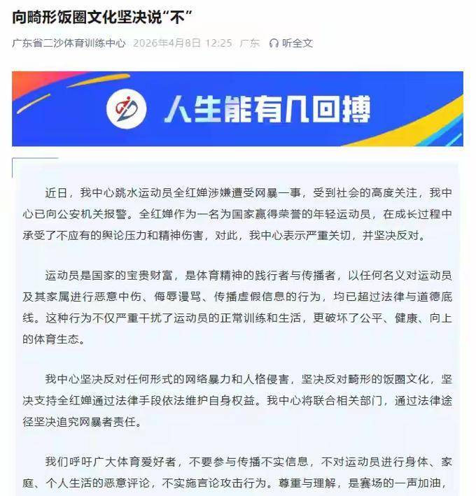 也许正是这些声响被捕捉和目睹了。在4月8日,全红婵工作的广东省体育局二沙体育训练中心决定采取行动,他们已经向公安部门报告了这一事件,并开始调查这批不良粉丝。