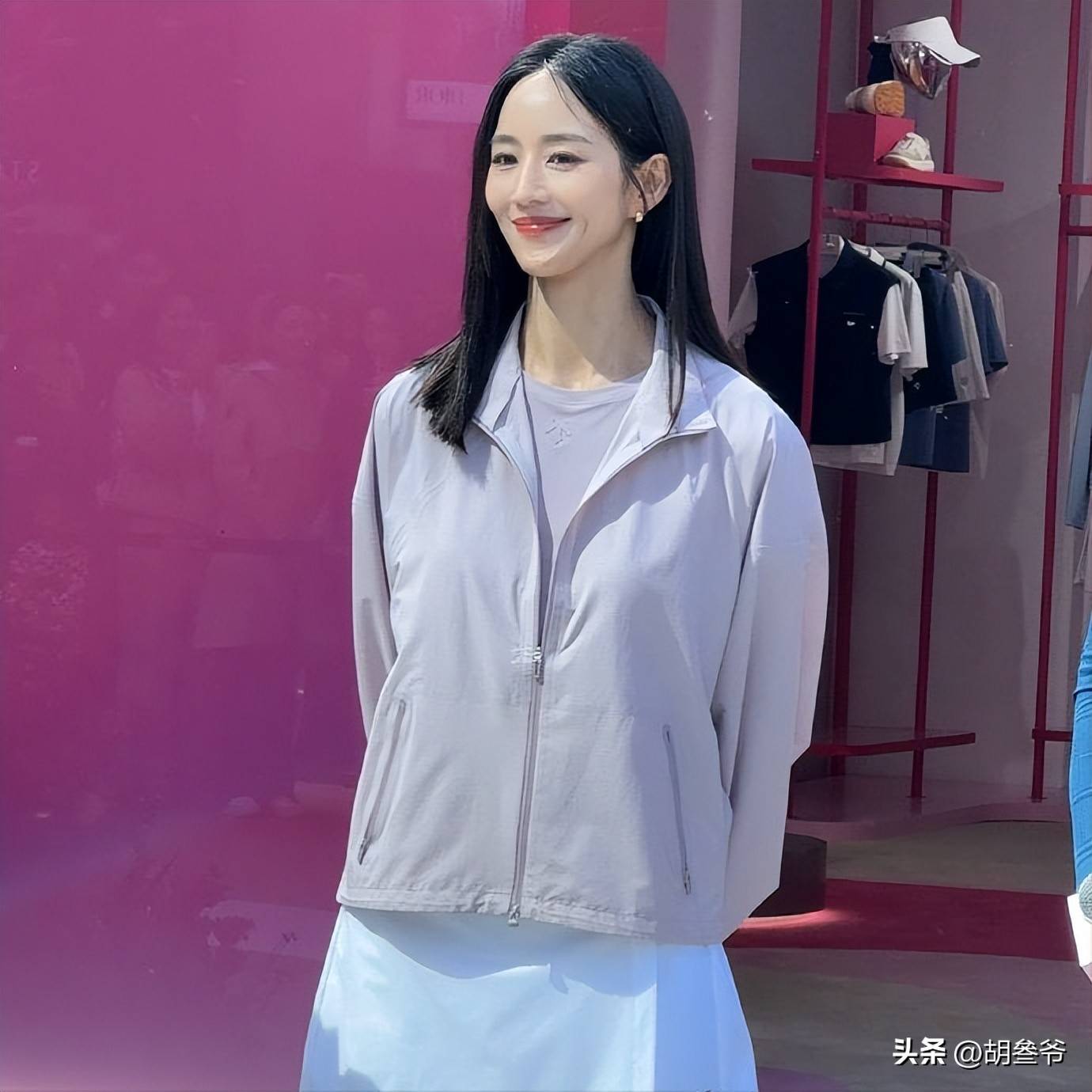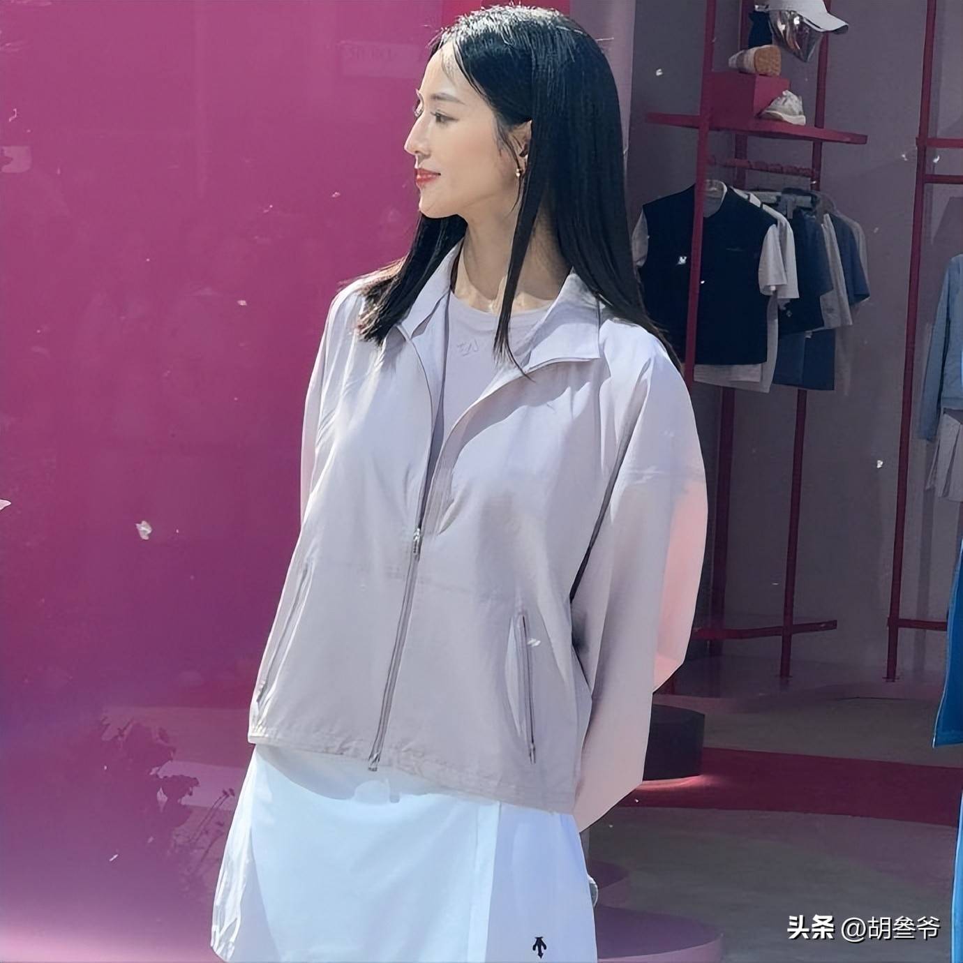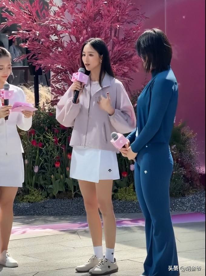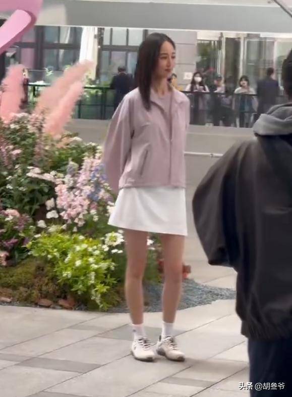 她当天身穿浅紫色防晒衣,里面搭配同色系短袖内搭,下半身搭配白色短裙,整套穿搭主打清新休闲风。