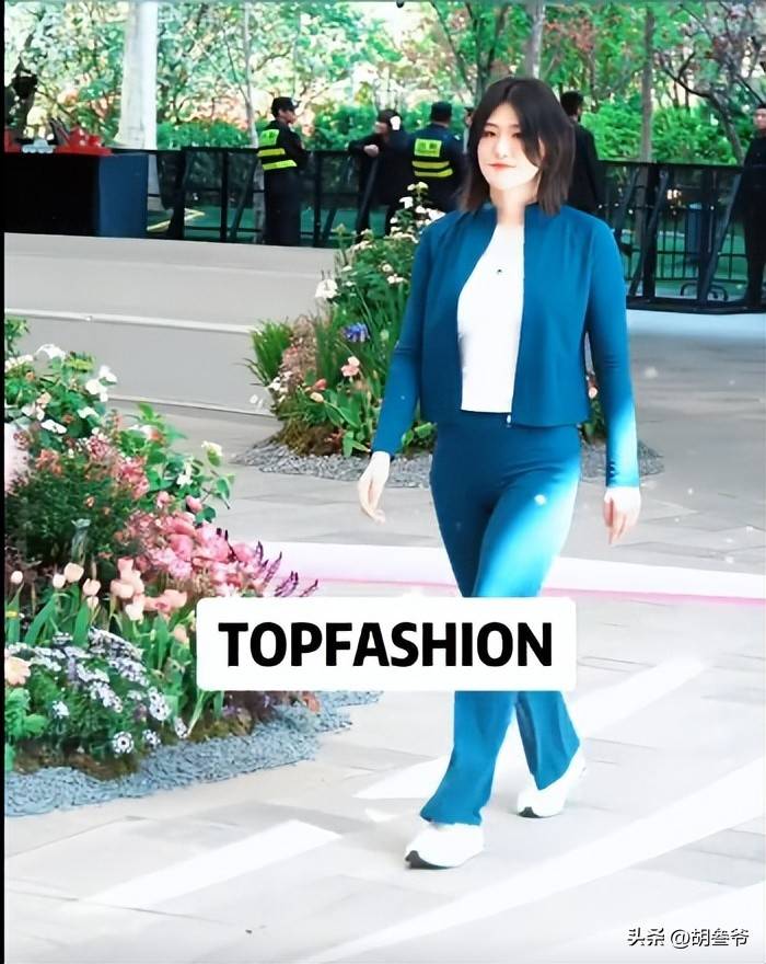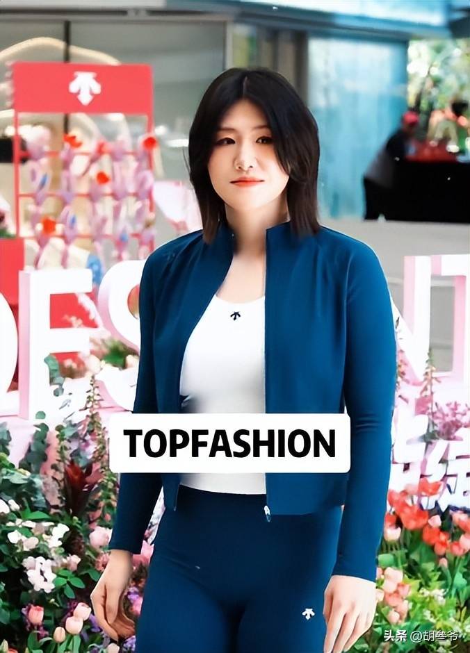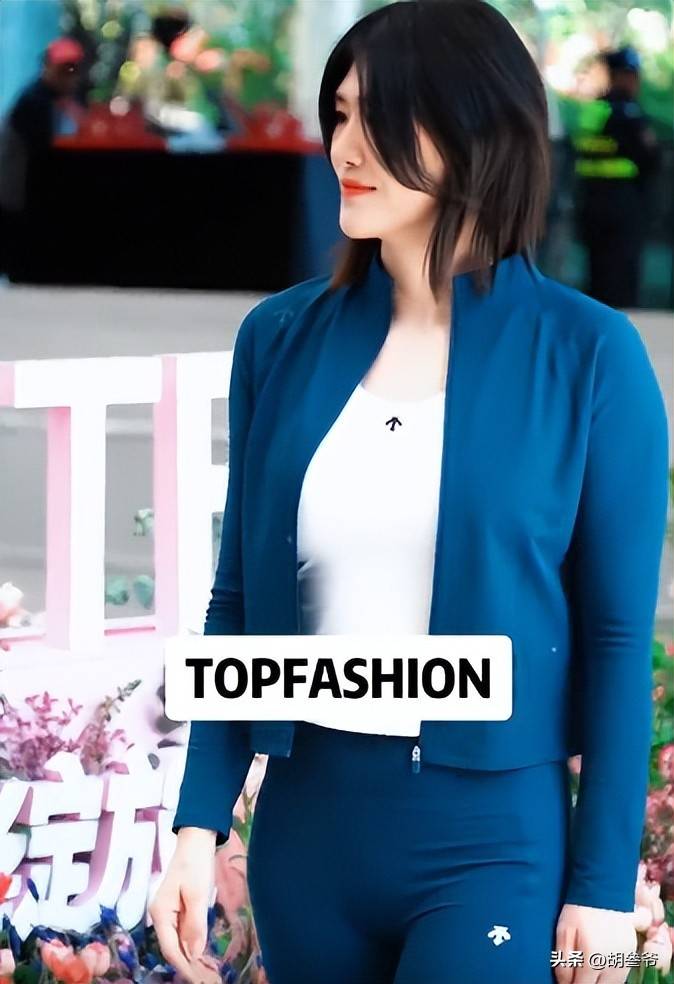 她当天穿的是深蓝色休闲修身瑜伽服套装,上半身是修身设计,里面还搭配了白色短袖,下半身是蓝色微喇裤。