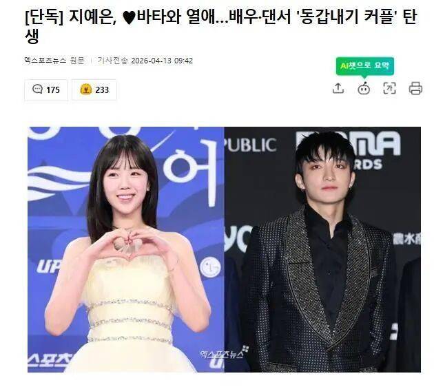 演艺圈又一对新CP诞生,这次的主角是演员池艺恩和编舞家Vata。据韩国媒体4月13日报道,这两位1994年出生的同龄人,目前正在甜蜜交往中。