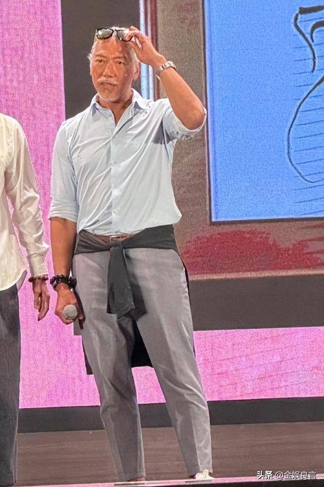 往那一站,身材壮硕得快把衬衫撑起来,浑身都透着一股霸气,和当年《古惑仔》里那个让人又恨又怕的“乌鸦哥”,气场丝毫不差。
