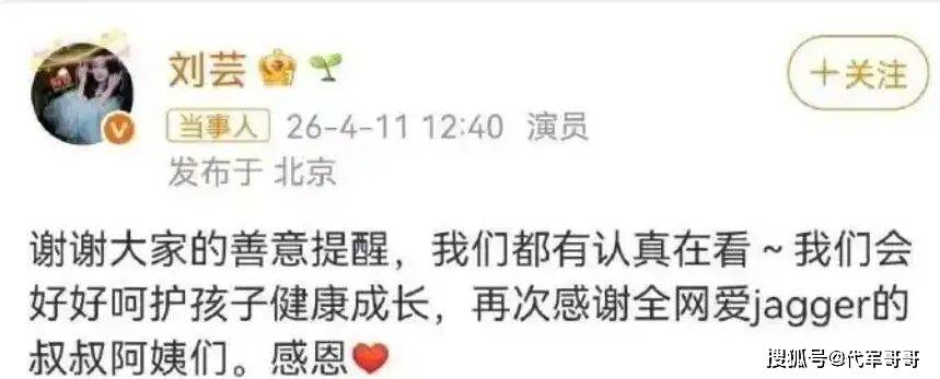 面对全网热议,刘芸与郑钧并没有回避,而是以高情商的方式坦然回应,收获了网友的一致认可。4月11日,郑钧率先发文,幽默解释Jagger的内八源于青春期“爱趿拉着穿鞋”的习惯,还自嘲“估计遗传我小时候的毛病”,同时承诺全家会监督孩子“挺起腰板,走出帅气步伐”,真诚感谢网友的惦记与善意;随后刘芸也同步回应,直言“谢谢大家的善意提醒,我们都有认真在看”,表态会好好呵护孩子健康成长,感恩全网对Jagger的关爱。