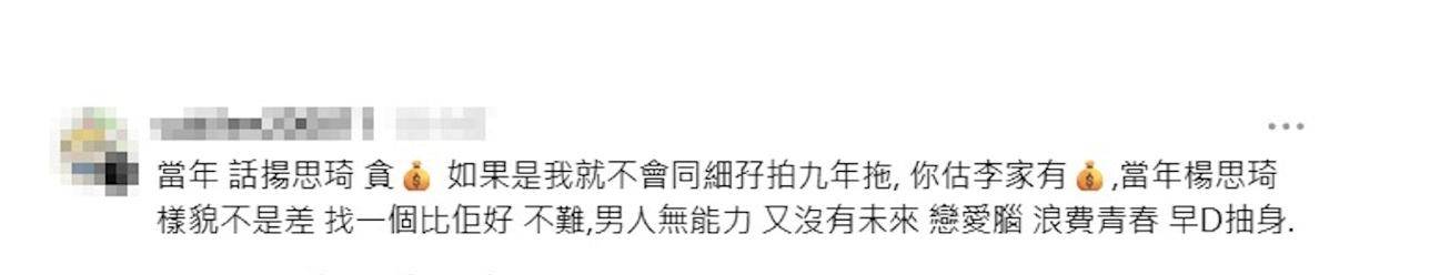 杨思琦2011年与李泳豪分手,饱受了争议以及评论,不能说杨思琦当年处理分手这件事的做法就完全正确,但是李家也的确有不少的问题,这才是让她要与李泳豪分手的导火索。如今分手15年,杨思琦与李泳豪再无交集,各自生活,各有家庭,当年的是非恩怨也不欲再提,杨思琦也没想过要为自己平反,没想到如今却因为李家家庭纠纷曝光,而间接令自己“沉冤得雪”。