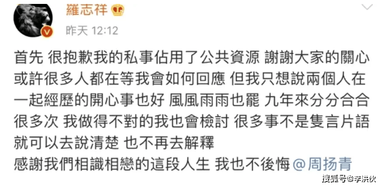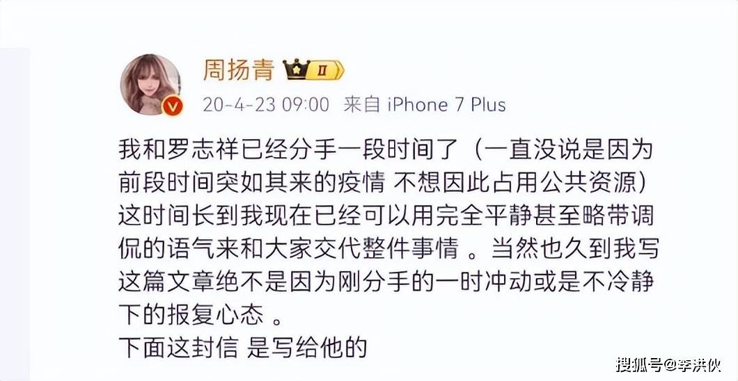2020年4月底的一天,罗志祥的女友周扬青直接一篇小作文炸翻了内娱。没有铺垫,也没留情面,开篇点题,直接把两人快10年的感情一股脑地抖了出来。