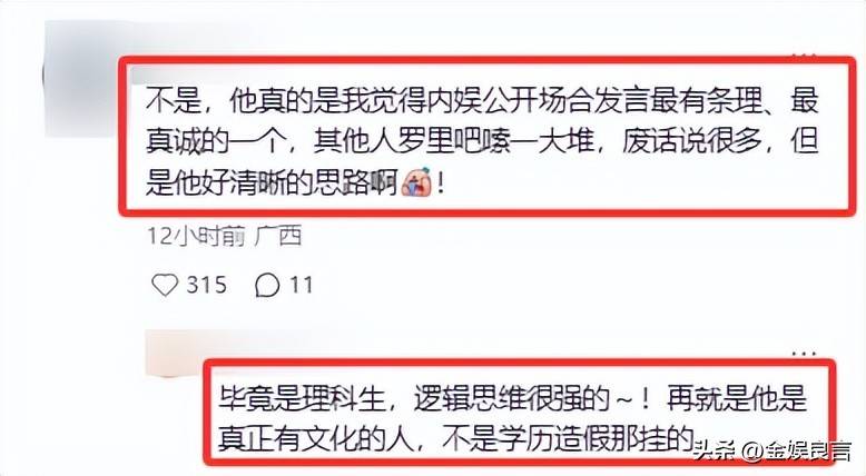 理科生出身的他,发言逻辑缜密、条理清晰,不煽情不浮夸,每一句话都说到人心坎里,即便没有站在C位,也用真诚与实力收获了观众与业内的认可。