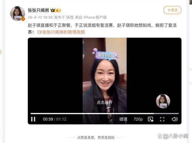 事件在4月13日迎来新的转折。当晚,赵子琪与导演于正、钟丽缇等人聚餐并开启直播。直播间里,有网友留言喊话“复活”,于正顺势透露了一个重要信息:《乘风2026》设有复活赛机制。