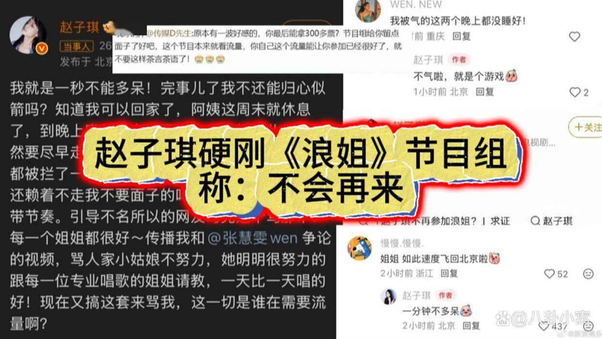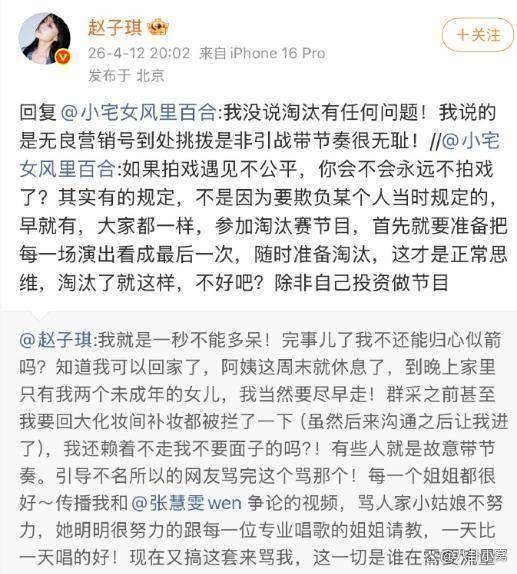 淘汰结果公布后,赵子琪的反应成为舆论焦点。4月11日凌晨,她在社交媒体发文:“我一点都不难过!不会再来!”这八个字配上感叹号,传递出一种复杂的情绪:既有释然,也有决绝。