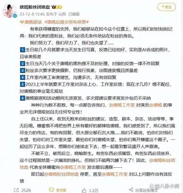 唐嫣后援会曾公开控诉工作室长期失职,指出其审美堪忧,生日写真竟用AI合成图敷衍了事;面对黑热搜置之不理,任由艺人被恶意抹黑;摄影、美工团队专业度极差,粉丝多次建议却拒不采纳;事业规划毫无章法,剧集宣发无效、商务资源懈怠。最终,唐嫣后援会同样宣布停更抗议,迫使工作室正视问题。