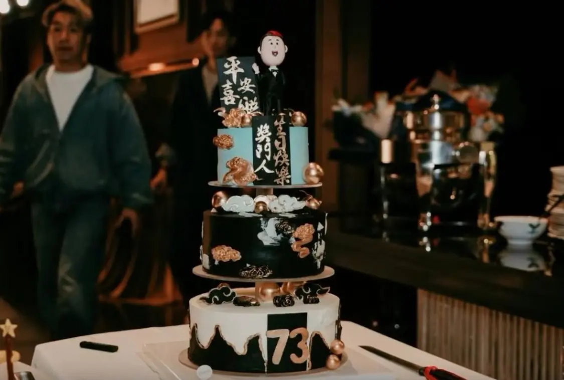 而现场为曾志伟准备蛋糕至少三个蛋糕。主蛋糕是有三层高,最上面一层放置了曾志伟的卡通公仔,还写着“平安喜乐”、“奖门人生日快乐”的字句,中间那一层以黑金呈现,最下面一层有“73”的标识,整个设计很有巧思。另外两个蛋糕,一个是以哈利波特城堡主题为主要造型的蛋糕,一个是传统的圆形的蛋糕。蛋糕都是摆设或是仪式感所需,众人合照的时候,将蛋糕包围在中间,这场面看起来就相当盛大。