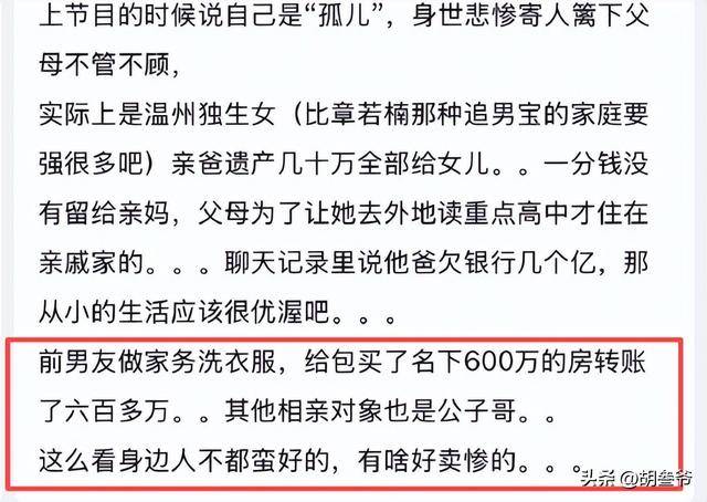 平时相亲接触的也大多是富二代,日子过得滋润又体面,和节目里的苦情形象完全是两个世界,而且还经常满嘴污言秽语。