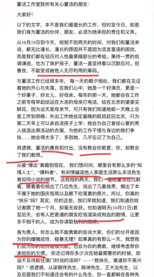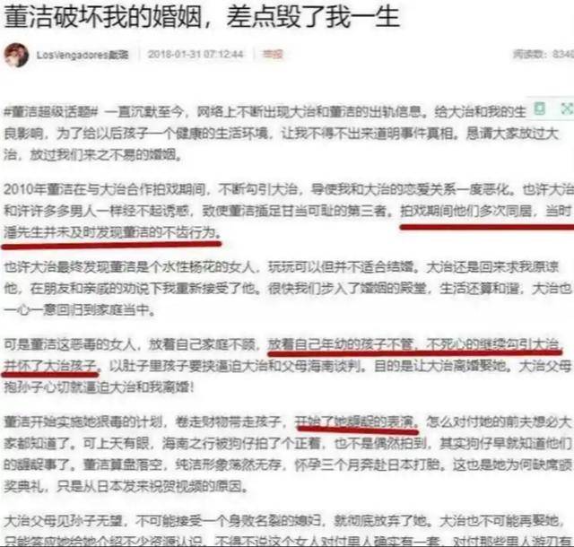 在2012年1月,董洁突然发表一篇长文,指责潘粤明参与赌博、实施家庭暴力以及存在性功能问题,这件事迅速引起轰动。